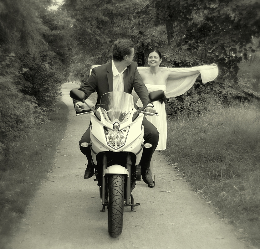 Aber wer macht ein Hochzeitsfoto auf dem es so aussieht als wenn Du vor Deiner Frau davon fährst?(Abgesehen vom Hauptständer)