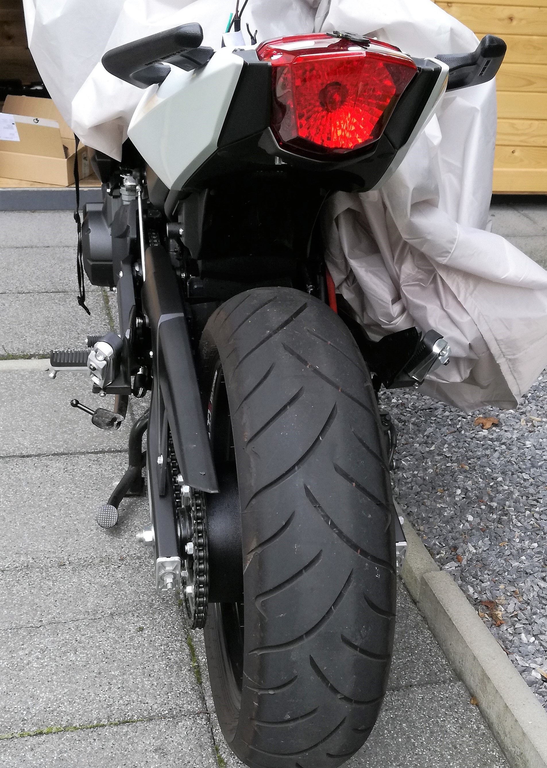 Wenn der Soziushaltebügel und die rechte Heckverkleidung abgenommen werden, kommt man wunderbar an den Kablebaum dran, wo alles mit Japansteckern verbunden ist.
